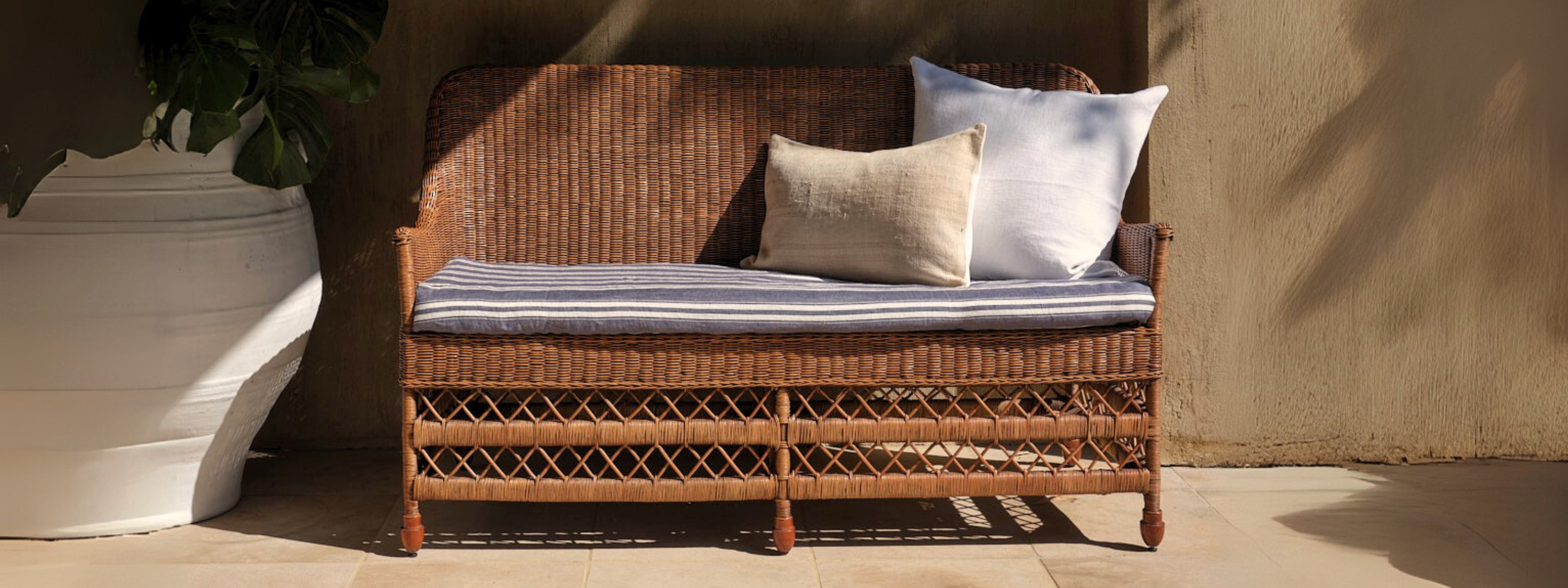 Rattan is durable but naturally porous. We recommend placing furniture in covered outdoor spaces to protect from direct rain and prolonged sun exposure. However, over time, rattan develops a natural patina, which enhances its character. Dust with a soft cloth and wipe gently with a damp cloth as needed. Avoid harsh chemicals.